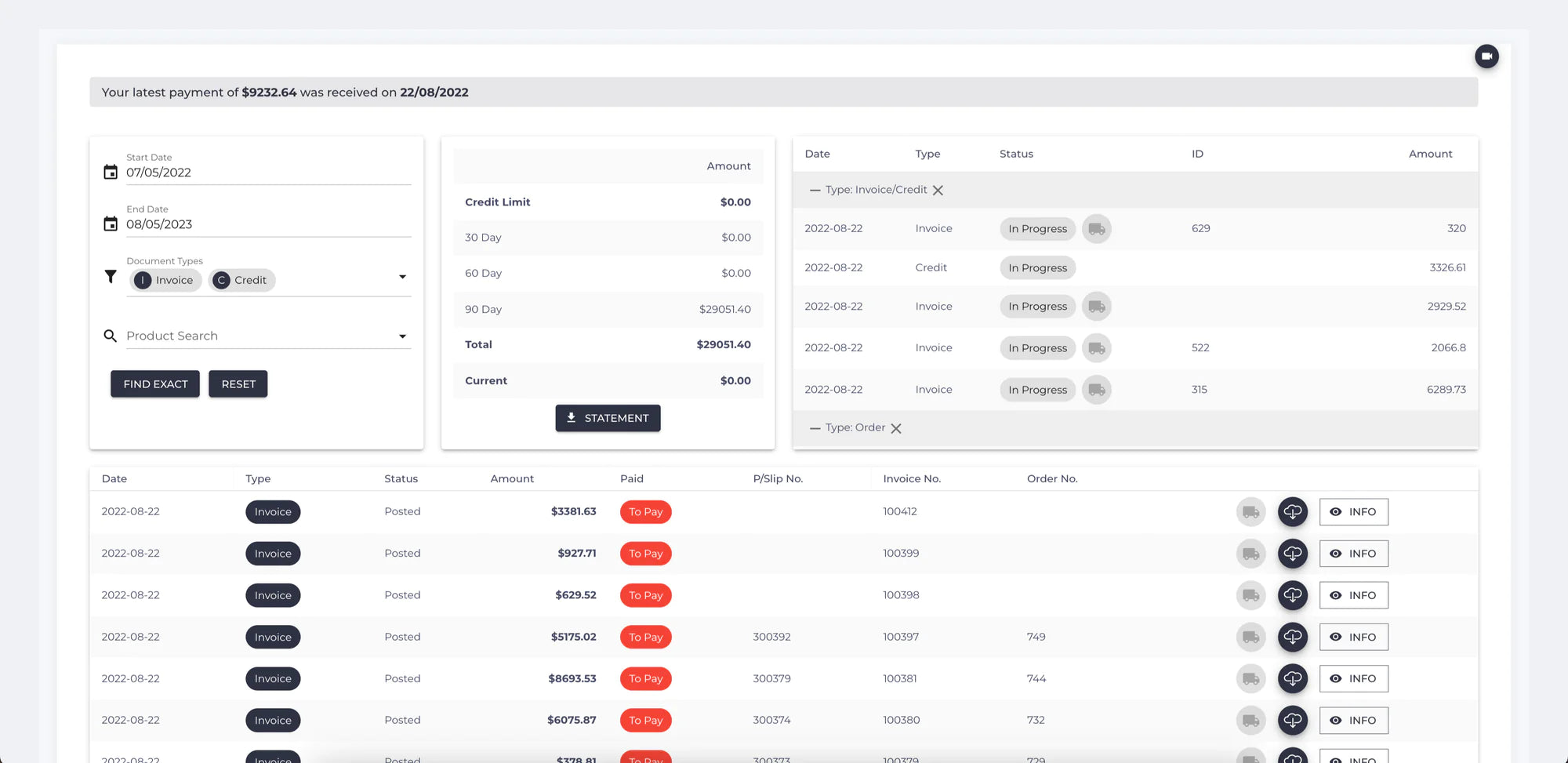 Allow your customers to see real-time account information in an intuitive interface, place orders, download invoices/statements and much more! -
